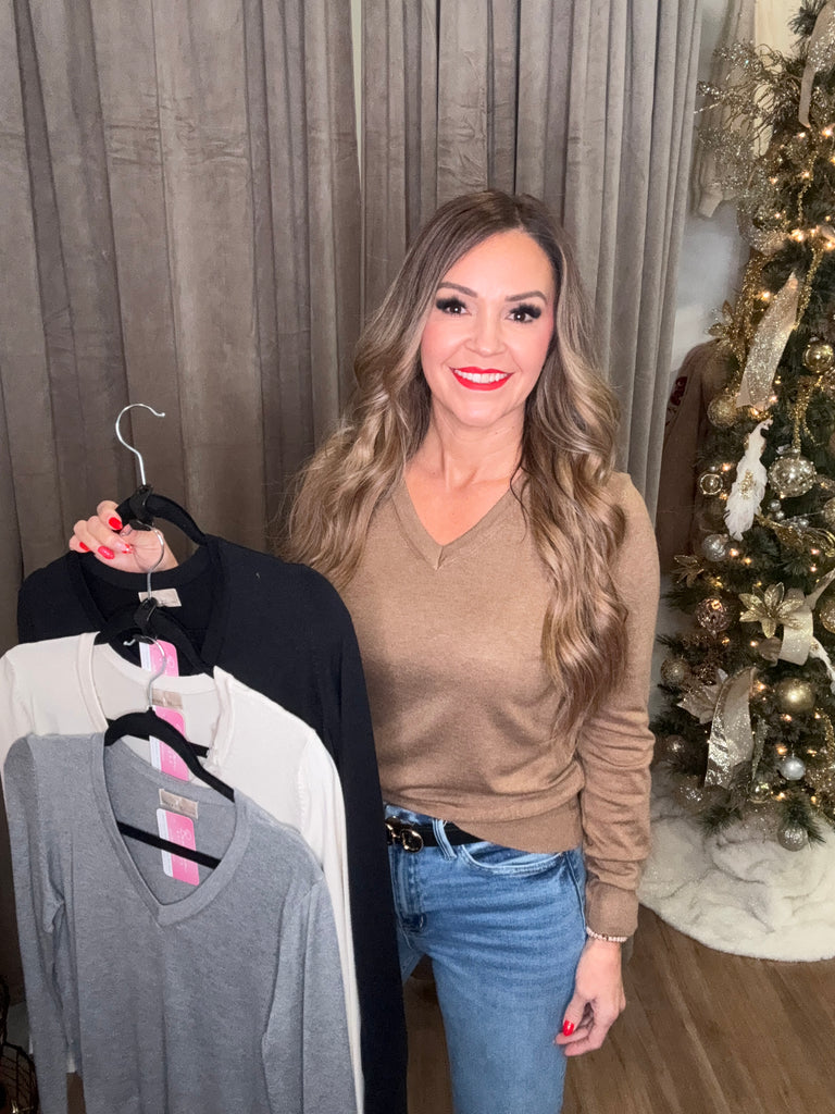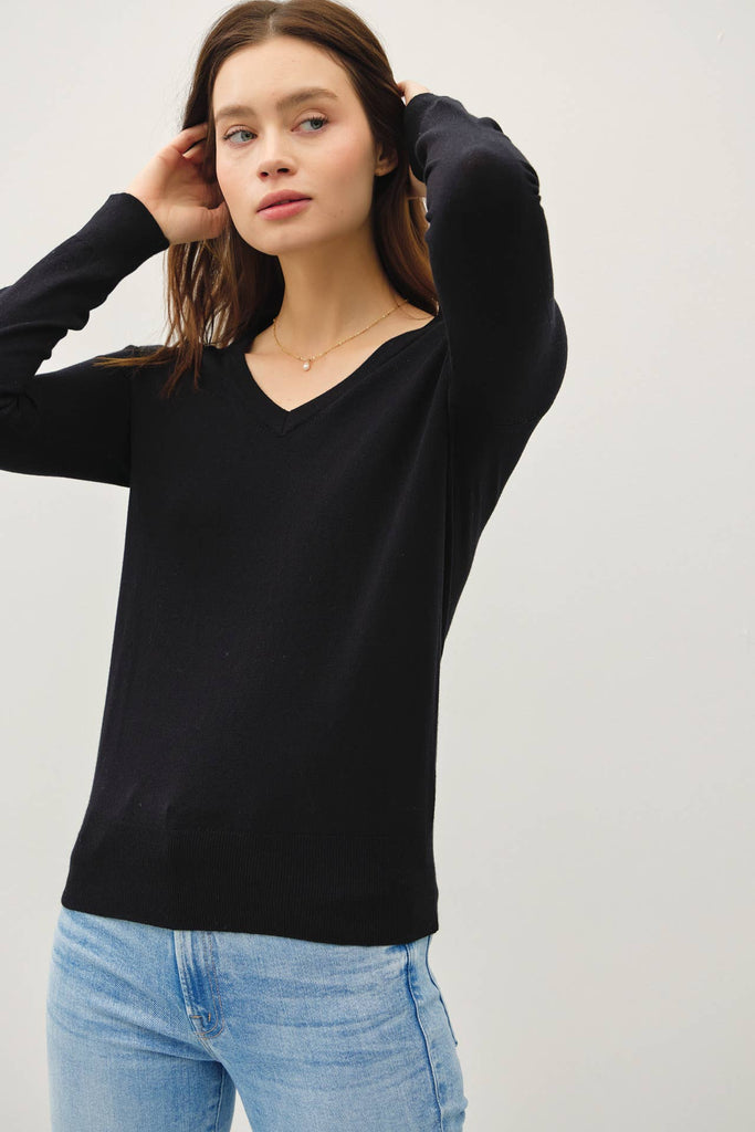 Stay cozy and stylish with our First Frost V-Neck Sweater in Black! This classic pullover features a flattering V neckline, long sleeves, and a relaxed yet fitted silhouette. Perfect for everyday wear and layering, this sweater comes in solid colors for easy styling. Get ready to bundle up and make a statement!