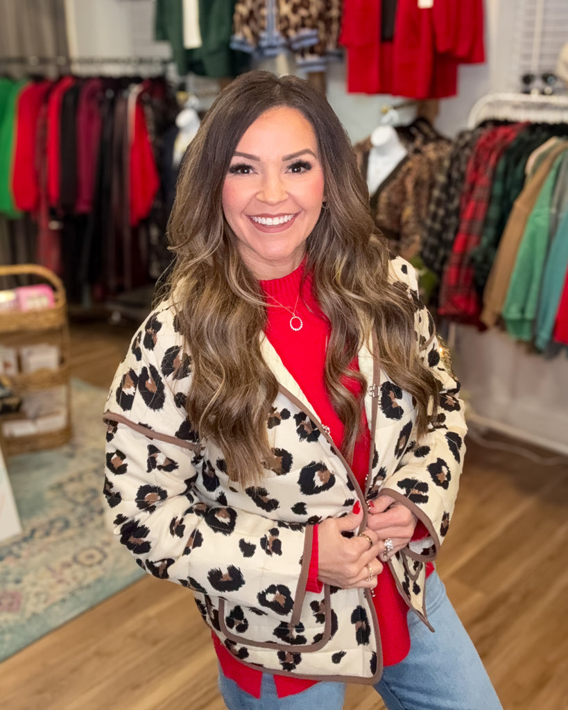The Etta Leopard Quilted Coat is your new go-to layer for chilly days with serious style. This cozy long-sleeve number features a gorgeous leopard print that adds a wild touch to any outfit, while the quilted construction keeps you warm without the bulk. Perfect for throwing over your favorite sweater or dress, it's the kind of piece that makes getting dressed actually fun. Whether you're running errands or meeting friends for coffee, this coat brings personality and comfort together in one fabulous package.