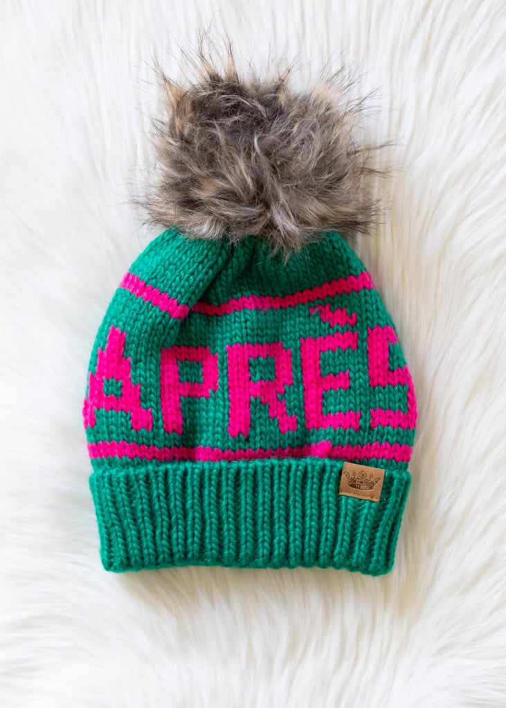 Green & pink Apres knit hat. Natural faux fur pom accent. Fleece lined