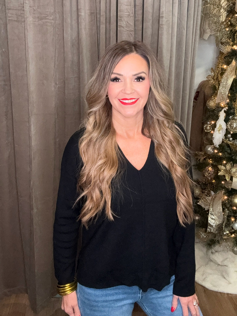 This sweater is your new go-to for cold weather comfort and style. With a soft texture, V neckline, and relaxed silhouette, it's perfect for everyday wear. The drop shoulder, center seam detail, and side slits add special touches. Get ready for fall and winter in this versatile and cozy black sweater!