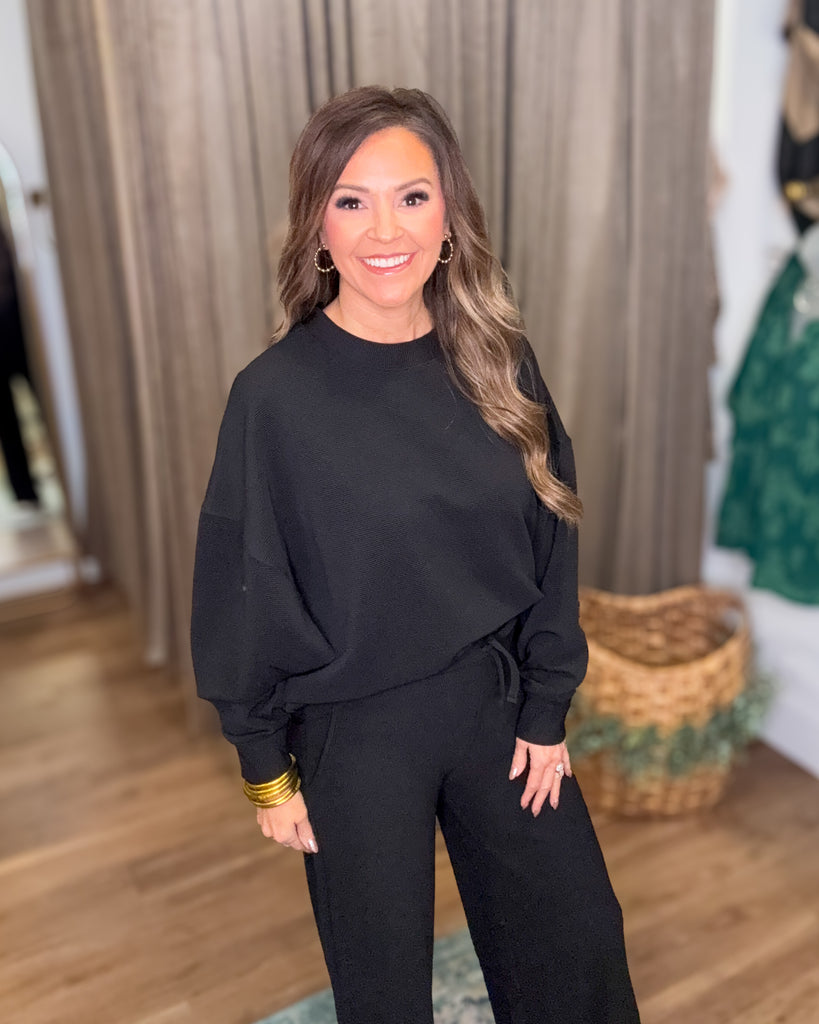 Get cozy and stylish in the Would Never End Set — a playful pairing of a ribbed round neck pullover and matching pants in sleek black. Perfect for lounging or casual outings, this set offers a comfy fit with a touch of effortless chic that keeps your look fresh from morning coffee to evening chill time.