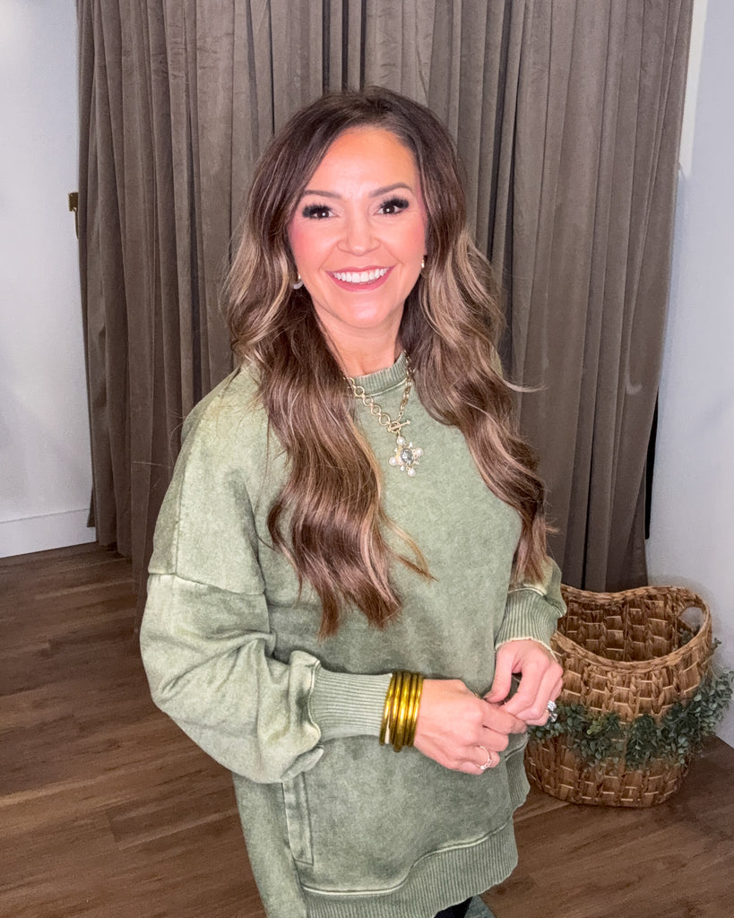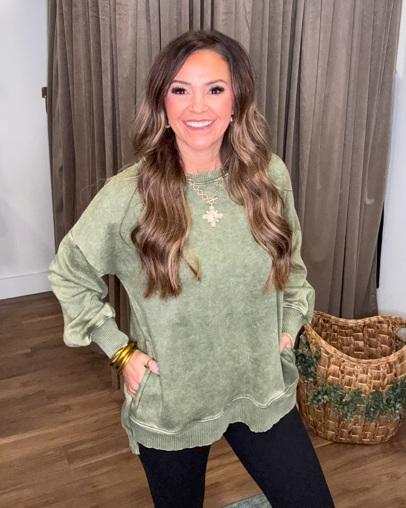 Cozy meets cool in the Hayleigh Sweatshirt in Light Olive. Featuring an acid wash fleece that feels dreamy soft, its hi-low hem adds a fun twist to your casual look. With easy-to-reach pockets, it’s perfect for keeping your hands warm or stashing little treasures. Whether you're lounging or out and about, this pullover brings laid-back vibes and playful style together effortlessly.