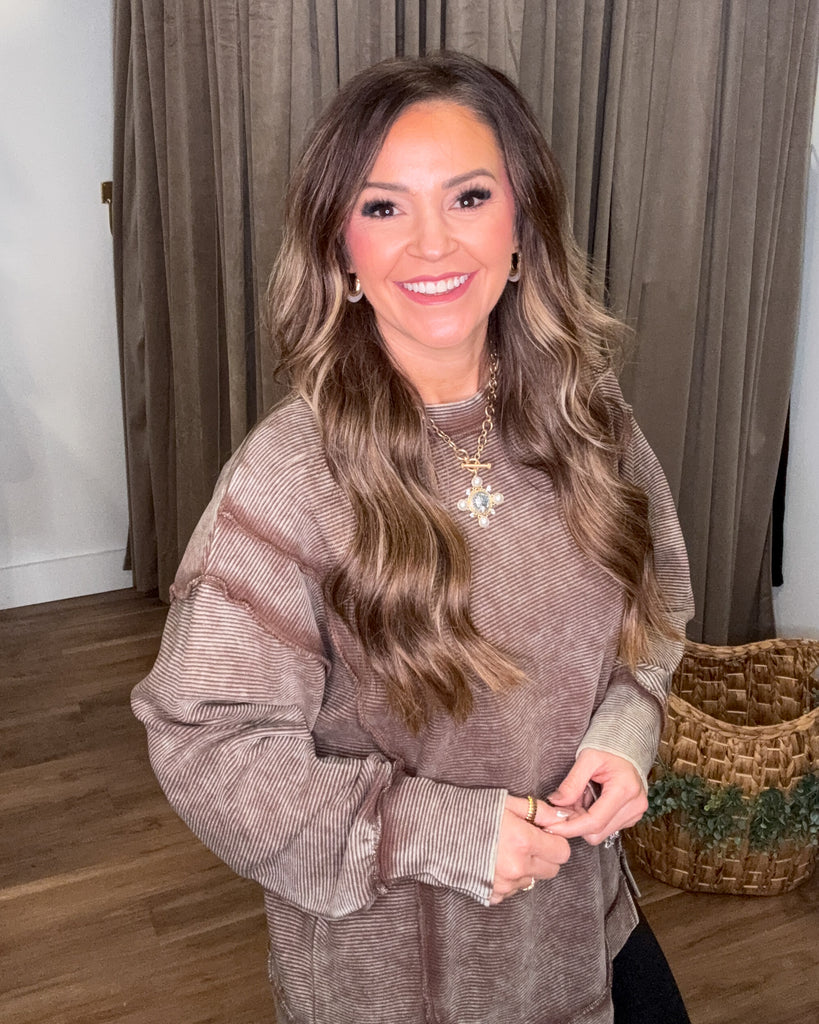 Stay cozy and stylish in the Romy Pullover – Brown. Crafted from soft, high-quality fabric, it features trendy acid-washed double ribbing and eye-catching exposed seams for that cool, lived-in vibe. The playful hi-low hem adds a fun twist, while the back patch detail sets you apart from the crowd. Perfect for layering or wearing solo, this pullover brings comfort and character to your casual wardrobe.