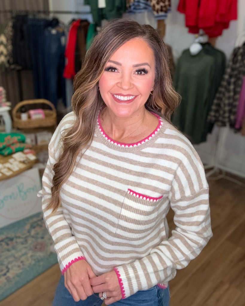 Cozy up in this charming striped long sleeve sweater that brings just the right amount of personality to your everyday wardrobe. Featuring vibrant pop-of-color stitching along the pocket and trim, it's the kind of piece that makes you smile when you put it on. Perfect for layering or wearing solo, this sweater strikes that sweet spot between comfortable and stylish—ideal for coffee dates, casual Fridays, or Saturday shopping.