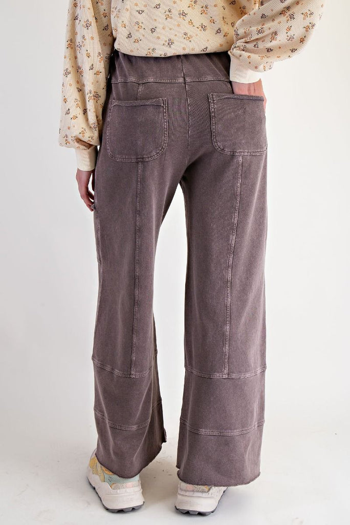 Slip into ultimate comfort with these All Up To You Pants in rich espresso. Crafted from soft washed terry, they feature a relaxed wide-leg silhouette that moves with you all day. The elastic waistband with drawstring tie keeps everything secure, while multiple cargo-style patch pockets add both function and flair. Panel stitching details elevate the casual vibe. Perfect for lounging, running errands, or making comfort look effortlessly cool.