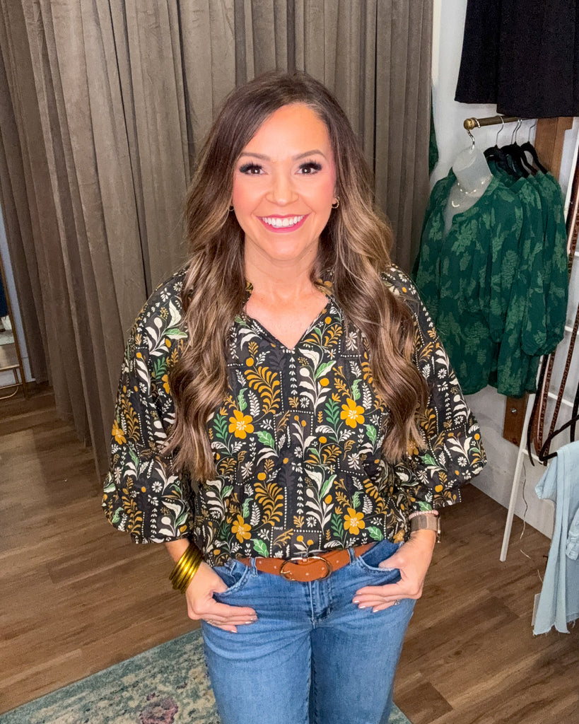 Brighten your wardrobe with the Calling My Name Top, featuring a playful floral print and charming scalloped hem. Its flattering V-neckline and ruffle collar add a flirty touch, while the 3/4 puff sleeves bring fun volume and effortless style. Perfect for days when you want to stand out with a feminine, breezy look.
