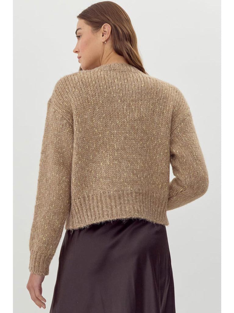 Introducing the Juliet Cardigan - Taupe. This mixture bulky knit cardigan features a split neck, gold button closure, front flap pockets, and long sleeves. Stay cozy and stylish with this button-up, lightweight cardigan made with a blend of polyester, nylon, and acrylic.